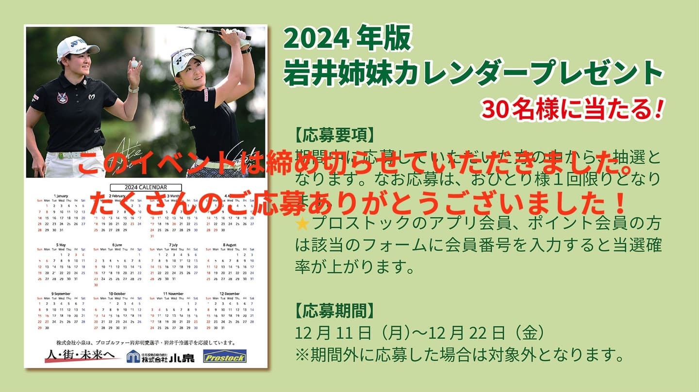 弊社がスポンサー契約をしているプロゴルファー岩井明愛(=いわいあきえ)選手・岩井千怜(=いわいちさと)選手は、本年も多くの大会で大活躍でした。そんな岩井姉妹の2024年版ポスター型カレンダーを30名様にプレゼント!プロストックのアプリ会員、ポイント会員の方は、当選確率が上がります。奮ってご応募ください。